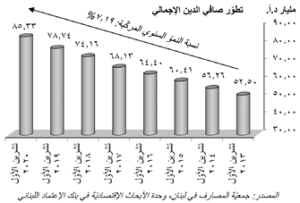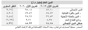 في هذا السياق، ارتفع صافي الدين العام، والذي يقتطع ودائع القطاع العام، بنسبة ٨،٣٦٪ على أساس سنوي الى ٨٥،٣٣ ملیار د،أ،، من ٧٨،٧٥ مليار د،أ في شهر تشرين الأول/أكتوبر ۲۰۱۹.