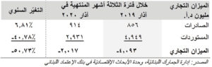 إنخفض عجز الميزان التجاري اللبناني بـ ٢،٠٨ مليار د.أ. على صعيدٍ سنوي إلى حوالي ٢،٠٢ مليار د.أ. خلال الفصل الأوّل من العام الجاري، من حوالي ٤،٠٩ مليار د.أ. في الفترة ذاتها من العام المنصرم، وذلك بحسب إحصاءات إدارة الجمارك اللبنانيّة. ويعود هذا الإنكماش في العجز إلى إنخفاض فاتورة المستوردات بنحو ٢،٠٢ مليار د.أ. إلى ٢،٩٣ مليار د.أ.، قابلها تحسّن في قيمة الصادرات بـ ٥٨،٢٥ مليون د.أ. إلى حوالي ٩١٤ مليون د.أ.