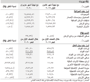 اظهرت البيانات المالية غير المدققة لبنك بيروت خسائر صافية بقيمة ٠،٥٧ مليون د.أ. خلال النصف الأول من العام ٢٠٢٠، مقابل أرباح بلغت ٦٥،٨٩ مليون د.أ. في الفترة ذاتها من العام ٢٠١٩. في التفاصيل، إرتفع صافـي الإيرادات من الفوائد بنسبة ٤٤،٦٨٪ على أساس سنوي إلى ١٦٩،٣٠ مليون د.أ. كما وسجل المصرف استردادات لمؤونات على خسائر إئتمانية متوقعة بقيمة ٢٤٣،٤٢ مليون د.أ. وقد طغى على هذا الإرتفاع تراجع صافـي الإيرادات من العمولات بنسبة ٦٥،٦١٪ إلى ١٧،٩٠ مليون د.أ. بالإضافة إلى إنكماش أرباح محفظة الأدوات المالية والإيرادات التشغيلية الأخرى بشكل كبير إلى خسائر بقيمة ٣١٢،٩٥ مليون د.أ. في هذا الإطار، إنكمش صافـي الايرادات التشغيلية بنسبة ٣٩،١٣٪ إلى ١١٥،٥٦ مليون د.أ. قابله تدن في الأعباء التشغيلية بنسبة ٣،٩٣٪ إلى ١٠٥،٥٩ مليون د.أ. أما على صعيد الميزانية، فقد تقلصت موجودات بنك بيروت بنسبة ١٠،٥٢٪ خلال النصف الأول من العام ٢٠٢٠ إلى ما فوق الـ١٤،٥٨ مليار د.أ.، وذلك في ظل تراجع محفظة التسليفات الصافية بنسبة ١٣،٩١٪ إلى حوالي ٤،٢٨ مليار د.أ. وإنكماش رصيد الصندوق والتوظيفات لدى المصارف المركزية بنسبة ٧،٤٢٪ إلى حوالي ٥،٦٨ مليار د.أ. كذلك انكمشت ودائع الزبائن لدى المصرف بنسبة ١٢،٣٤٪ خلال الأشهر الستة الأولى من العام ٢٠٢٠ إلى ١٠،٧٧ مليار د.أ.، لينخفض بذلك معدل التسليفات الصافية من ودائع الزبائن الى ٣٩،٧٣٪ من ٤٠،٤٥٪ في نهاية العام ٢٠١٩. وقد ارتفعت الأموال الخاصة للمصرف بنسبة ٠،٨٠٪ خلال الفترة المذكورة إلى ١،٥٩ مليار د.أ. في نهاية شهر حزيران/يونيو٢٠٢٠.
