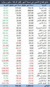 وعلى مستوى التسعة أشهر الأولى من عام ٢٠٢٠، كشفت إحصائية، ارتفاع الأرباح المجمعة لشركات التأمين نحو ٨٤٪، إلى ١،٦٨ مليار ريال مقابل ٩١٦،٧ مليون ريال للأشهر التسعة الأولى من العام الماضي.