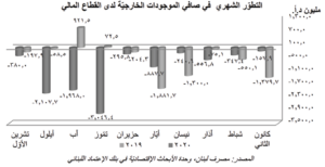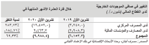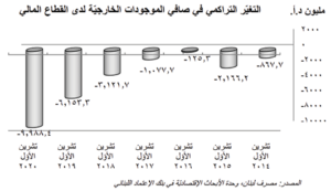 سجل صافـي الموجودات الخارجية لدى القطاع المالي اللبناني تراجع بلغ ٣٨٠،٠ مليون د،أ، خلال الشهر العاشر من العام ٢٠٢٠ مقابل انكماش بلغ ٢،١٠٧،٧ مليون د،أ، في شهر أيلول/سبتمبر وتراجع بلغ ١،٩٦٨،٠ مليون د،أ، في شهر آب/أغسطس وتأتي أرقام شهر تشرين الأول/أكتوبر نتيجة إنخفاض صافـي الموجودات الخارجية لدى مصرف لبنان بقيمة ٤٨٩،٦ مليون د،أ، ما طغى على إرتفاع صافـي الموجودات الخارجية لدى المصارف والمؤسسات المالية بمبلغ قدره ١٠٩،٦ مليون د،أ، كذلك على صعيد تراكمي، فقد تقلص صافـي الموجودات الخارجية لدى القطاع المالي اللبناني بحوالي ٩،٩٩ مليار د،أ، خلال الأشهر العشرة الأولى من العام ٢٠٢٠، مقارنة بإنخفاض بلغ ٦،١٥ مليار د،أ، في الفترة نفسها من العام ٢٠١٩، ويعزى الإنخفاض المذكور إلى تراجع صافـي الموجودات الخارجية لدى مصرف لبنان بمبلغ قدره ١٢،٤٥ مليار د،أ، حتى شهر تشرين الأول/أكتوبر، والذي فاق بشكل كبير إرتفاع صافي الموجودات الخارجية لدى المصارف والمؤسسات المالية بحوالي ٢،٤٦ مليار د،أ.