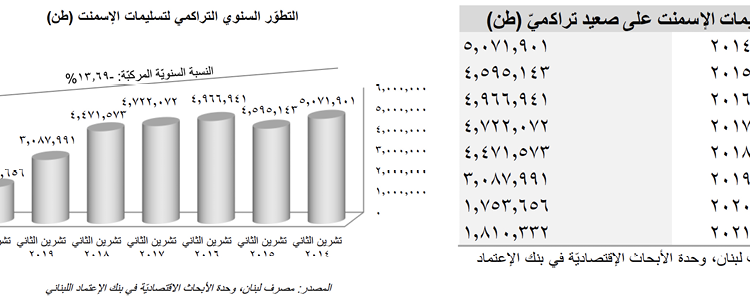 يظهِر البيان أعلاه أن نسبة النمو السنوي المركب (Compounded Annual Growth Rate) لتسليمات الاسمنت كانت سلبية عند ١٣،٦٩٪ خلال الفترة الممتدة بين شهري تشرين الثاني/نوفمبر ٢٠١٤ وتشرين الثاني/نوفمبر ٢٠٢١، ما يعكس ضعفاً في ديناميكية قطاع البناء في ظل الركود الإقتصادي الذي تشهده البلاد.