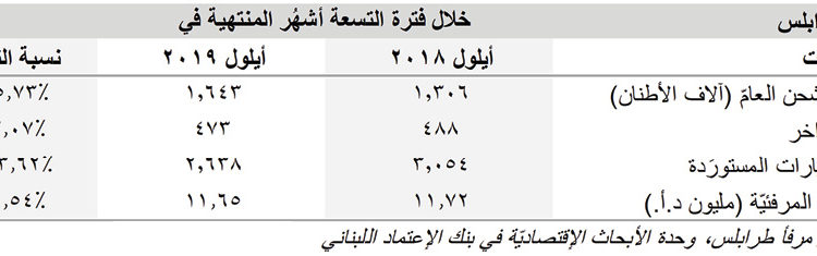 حركة مرفأ طرابلس ترتفع بنسبة ٢٥،٧٣٪ سنويًا لغاية أيلول/سبتمبر ٢٠١٩
