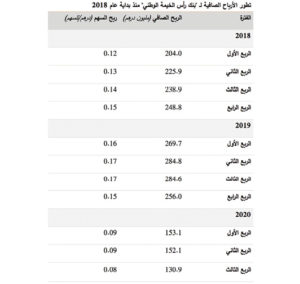 تراجعت أرباح «بنك رأس الخيمة الوطني»، المملوك بنسبة ٤٩٪، من قبل حكومة رأس الخيمة، إلى ٤٣٦ مليون درهم (٠،٢٦ درهم/للسهم) في نهاية التسعة أشهر الأولى ٢٠٢٠، بنسبة ٤٨٪ مقارنة بأرباح الفترة نفسها من عام ٢٠١٩، كما يوضح الجدول التالي: