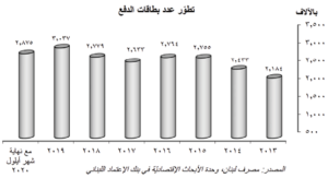 تشير الإحصاءات الصادرة عن مصرف لبنان الى تراجع عدد بطاقات الدفع بنسبة ٥،٣١٪ (١٦١،٣١٧بطاقة) خلال الأشهر التسعة الأولى من العام ۲۰۲۰ الى ٢،٨٧٥،٤٣٩ بطاقة، من ٣،٠٣٦،٧٥٦ بطاقة في نهاية العام ۲۰۱۹. في التفاصيل، ارتفع عدد بطاقات الدفع الفوري بـ ٣٤،٧٦٥ بطاقة حتى شهر أيلول/سبتمبر ۲۰۲۰ الی ١،٨٨٨،٨٠٩، فيما انخفض عدد البطاقات الائتمانيّة بـ ١٣٨،٠٢١الى ٤١٨،٠٧٠ بطاقة وتدنّي عدد بطاقات الدفع لأجل بـ١٥،٩١٥ بطاقة الى ۹۰،۱۳۸ وتراجع عدد البطاقات المدفوعة مسبقًا بـ ٤٧٨،٤٢٢ بطاقة. يعزى التراجع في عدد بطاقات الدفع الى السقوف التي وضعتها المصارف على عمليّات الدفع خارج لبنان والتي بسببها امتنع اصحاب البطاقات عن تجديدها أو الاستحصال على بطاقات جديدة.