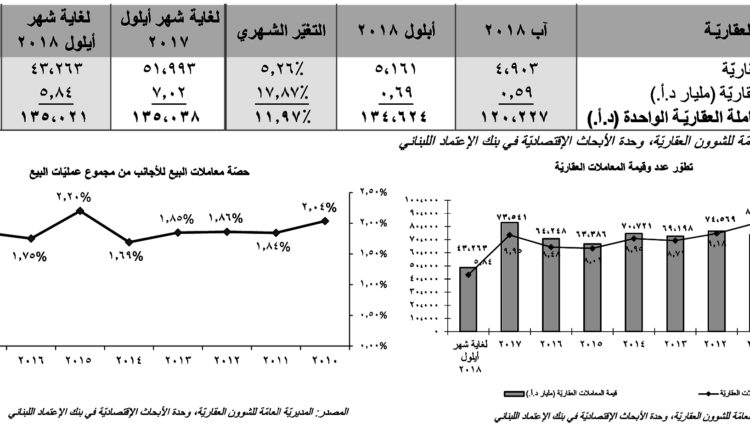شهد القطاع العقاري في لبنان بعض الإنتعاش خلال الشهر التاسع من العام الحالي بحيث ارتفع عدد معاملات المبيع العقارية بنسبة ٥،٢٦٪ خلال شهر ايلول/سبتمبر ٢٠١٨ الى ٥،١٦١ معاملة، من ٤،٩٠٣ معاملة في الشهر الذي سبقه. كذلك زادت قيمة المعاملات العقارية بنسبة ١٧،٨٧٪ على أساس شهري الى ٠،٦٩ مليار دأ.، من ٠،٥٩ مليار د.أ. في شهر…