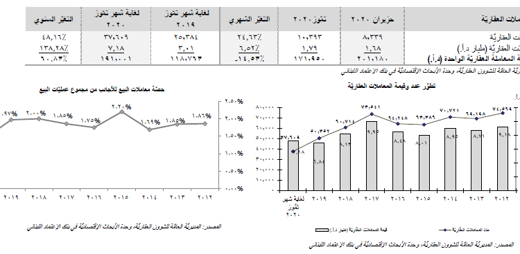 انتعش كل من عدد وقيمة المعاملات العقارية في لبنان خلال شهر تموز/يوليو ٢٠٢٠. بالتفاصيل، فقد إرتفع عدد معاملات المبيع العقارية بنسبة ٢٤،٦٣٪ خلال الشهر السابع من العام ٢٠٢٠ إلى ١٠،٣٩٣ معاملة، كما وزادت قيمة المعاملات العقارية بنسبة ٦،٥٢٪ إلى ١،٧٩ مليار د.أ. نتيجة لذلك، إنخفض متوسط قيمة المعاملة العقارية الواحدة بنسبة ١٤،٥٣٪ على أساس شهري…