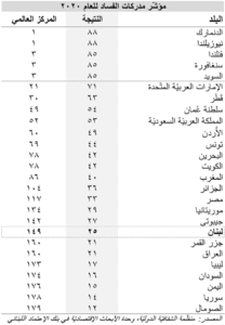 على الصعيد المحلّي، جاء لبنان في المرتبة ١٤٩ في العالم في مؤشّر مدركات الفساد للعام ٢٠٢٠، متراجعًا بذلك ١٢ مرتبة عن المركز ١٣٧ الذي كان قد شغله في العام ٢٠١٩ مع تدهور نتيجته في المؤشّر المذكور من ٢٨ إلى ٢٥. هذه النتيجة وضعت لبنان في المركز الـ ١٤إقليميًّا مسبوقًا من جيبوتي (النتيجة: ٢٧؛ المركز العالمي: ١٤٢) ومتبوعًا من جزر القمر (النتيجة: ٢١؛ المركز العالمي: ١٦٠). كما وذكر التقرير أنّه بالرغم من المظاهرات الحاشدة ضدّ الفساد في شهر تشرين الأول/أكتوبر ٢٠١٩ فإنّه لم يحصل أيّ تقدّم جدّي في هذا الخصوص، مضيفًا بأنّ عمليّة المحاسبة المتعلّقة بإنفجار مرفأ بيروت تبقى محدودة. إلّا أنّ التقرير لفت إلى بعض بوارق الأمل المتعلّقة بإقرار القانون المتعلّق بالإثراء غير المشروع ومشروع قانون تحسين الولوج إلى المعلومات وإقرار إستراتيجيّة الهيئة الوطنيّة لمكافحة الفساد.