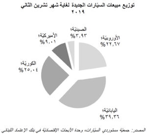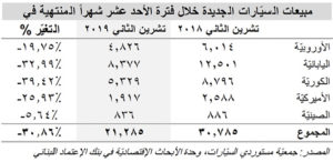 استنادًا إلى إحصاءات جمعية مستوردي السيارات، وصلت مبيعات السيارات الجديدة في لبنان إلى ٤٦٠ سيارة خلال شهر تشرين الثاني/نوفمبر ٢٠١٩ وهو أدنى مستوى لها منذ شهر كانون الأول/ديسمبر ۲۰۱۰ على الأقل، مقارنة مع ٩٦٠ سيارة في شهر تشرين الثاني/نوفمبر و٢،١٩٥ سيارة في شهر تشرين الثاني/نوفمبر ۲۰۱۸ في ظل الأوضاع المالية والسياسية الصعبة. كذلك على صعيد تراكمي، فقد انخفضت مبيعات السيارات الجديدة بنسبة ٣٠،٨٦٪ سنويًا إلى ٢١،٢٨٥ سيارة مع نهاية الأشهر الأحد عشر الأولى من العام ٢٠١٩، من ٣٠،٧٨٥ سيارة في الفترة ذاتها من العام ٢٠١٨. يعود ذلك بالأخص إلى تراجع مبيعات السيارات الكورية بنسبة ٣٩،٤٢٪ إلى ٥،٣٢٩ سيارة، ترافقًا مع انكماش مبيع السيارات اليابانية بنسبة ٣٢،٩٩٪ إلى ٨،٣٧٧ سيارة وانخفاض مبيعات السيارات الأوروبية بنسبة ١٩،٧٥٪ إلى ٤،٨٢٦ سيارة للذكر لا للحصر. يجدر الذكر، في هذا السياق، أن عدد السيارات المستوردة عبر مرفأ بيروت كان قد تقلّص بنحو ١٢،١١٪ سنويًا خلال الأشهر العشرة الأولى من العام ۲۰۱۹. وتبيّن الإحصاءات أن السيارات اليابانية الصنع، قد تصدرت مبيعات السيارات الجديدة في لبنان بحيث بلغت حصتها من السوق ٣٩،٣٦٪ لغاية شهر تشرين الثاني/نوفمبر ۲۰۱۹، تلتها السيارات الكورية (٢٥،٠٤٪) والأوروبية (٢٢،٦٧٪)، ومن ثم السيارات الأميركية (٩،٠١٪) والصينية (٣،٩٣٪).