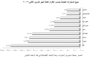 أما بالنسبة لطراز السيارات المباعة، فقد حافظت ماركة «كيا» الكورية على مركزها الريادي لجهة مبيعات السيارات الجديدة، مسجلة مبيع ٣،١٤٤ سيارة في الأشهر الأحد عشر الأولى من العام ۲۰۱۹ لتحصل حصتها من السوق إلى ١٤،٧٧٪، تلتها ماركة «تويوتا» اليابانية (٢،٣٦٣ سيارة <١١،١١٠٪>) وماركة «نيسان» اليابانية (٢،٣٠٠ سيارة <١٠،٨١٪>)، للذكر لا الحصر.