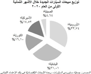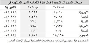 إستنادًا إلى احصائات جمعية مستوردي السيارات، تراجعت مبيعات السيارات الجديدة في لبنان إلى ١٨٦ سيارة خلال شهر آب/أغسطس ٢٠٢٠ مقارنةً مع ٦٢٤ سيارة في شهر تموز/يوليو، على أثر إنفجار مرفأ بيروت الذي شلّ الحركة الاقتصادية في البلاد في الرابع من الشهر المذكور، علمًا بأنها بلغت ٢،٠٤١ سيارة في الشهر نفسه في العام السابق. كذلك على صعيد تراكمي، فقد انخفضت مبيعات السيارات الجديدة بنسبة ٧٣،٥٣٪ سنويًا إلى ٤،٨٠٨ سيارة خلال الأشهر الثمانية الأولى من العام الحالي، مقابل ١٨،١٦٥ سيارة في الفترة نفسها من العام المنصرم. يعزى التراجع المذكور إلى النقص في السيولة بالدولار الأميركي في القطاع المصرفـي والقيود التي تم فرضها على السحوبات بالعملة الأجنبية ما أعاق عمليات بيع السيارات الجديدة حيث أن شروط المبيع الجديدة لدى وكلاء السيارات تطالب بتسديد جزء من سعر المبيع نقدًا بالدولار. في التفاصيل، تراجعت مبيعات السيارات اليابانية بنسبة ٧٨،٩٨ ٪ إلى ١،٤٩١ سيارة، رافقها إنكماش في مبيع السيارات الكورية بنسبة ٨٣،٥٩٪ الى ٧٧٤ سيارة وإنخفاض في مبيعات السيارات الأوروبية الصنع بنسبة ٥٩،٥٥٪ إلى ١،٦٢٢ سيارة للذكر لا للحصر. يجدر الذكر، في هذا السياق، أن عدد السيارات المستوردة عبر مرفأ بيروت كان قد تقلص بـ٧٦،٨٠٪ سنويًا لغاية شهر آب/أغسطس ٢٠٢٠. وتبيّن الاحصاءات أن السيارات الاوروبية الصنع قد تصدرت مبيعات السيارات الجديدة في لبنان، بحيث بلغت حصتها من السوق ٣٣،٧٤٪ مع نهاية شهر آب/أغسطس ٢٠٢٠، تلتها السيارات اليابانية (٣١،٠١٪) والكورية (١٦،١٠٪)، ومن ثم السيارات الأميركية (١٤،٥٢٪) والصينية (٤،٦٤٪).