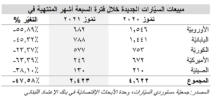 إستناداً إلى إحصاءات جمعية مستوردي السيارات، تراجعت مبيعات السيارات الجديدة في لبنان إلى ٣٨٦ سيارة خلال شهر تموز/يوليو ٢٠٢١ مقارنة مع ٦٠٢ سيارة في شهر حزيران/يونيو، علماً بأنها بلغت ٦٢٤ سيارة في الشهر نفسه من العام ٢٠٢٠. أما على صعيدٍ تراكمي،ٍ فقد إنخفضت مبيعات السيارات الجديدة بنسبة ٤٧،٥٨٪ سنوياً إلى ٢،٤٢٣ سيارة خلال الأشهر السبعة الأولى من العام الحالي، من ٤،٦٢٢ سيارة في الفترة نفسها من العام المنصرم. يُعزى التراجع المذكور إلى النقص في السيولة بالدولار الأميركي في القطاع المصرفـي والقيود التي تم فرضها على السحوبات بالعملة الأجنبية ما أعاق عمليات بيع السيارات الجديدة، حيث أن شروط المبيع الجديدة لدى وكلاء السيارات تفرض تسديد جزء كبير من سعر المبيع نقداً بالدولار. بالتفاصيل، تراجعت مبيعات السيارات اليابانية بنسبة ٤٥،٣٢٪ إلى ٧٨٨ سيارة في الأشهر السبعة الأولى من العام رافقها إنكماش بنسبة ٢٣،٣٧٪ في مبيع السيارات الكورية إلى ٥٧٧ سيارة وإنخفاض بنسبة ٥٥،٨٩٪ في مبيع السيارات الأوروبية إلى ٦٨٢ سيارة للذكر لا للحصر. وتُبيّن الإحصاءات كذلك أن السيارات اليابانية الصنع قد تَصَدَّرَت مبيعات السيارات الجديدة في لبنان، بحيث بلغت حصتها من السوق ٣٢،٥٢٪ حتى شهر تموز/يوليو ٢٠٢١، تلتها السيارات الأوروبية (٢٨،١٥٪) والسيارات الكورية (٢٣،٨١٪)، ومن ثم السيارات الأميركية ) (١٠،١٥٪) والصينية (٥،٣٧٪).
