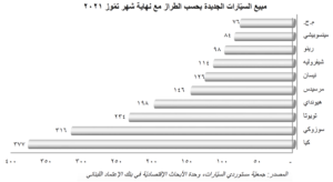 أما بالنسبة لطراز السيّارات المباعة، فقد إحتلت ماركة «كيا» الكورية المركز الريادي لجهة مبيعات السيارات الجديدة، مسجلة مبيع ٣٧٧ سيارة حتى شهر تموز/يوليو ٢٠٢١ لتصل حصتها من السوق إلى ١٥،٥٦٪، تلتها ماركة «سوزوكي» اليابانية (٣١٦ سيارات <١٣،٠٤٪>) وماركة «تويوتا» اليابانية (٢٣٤ سيارات <٩،٦٦٪>)، للذكر لا للحصر.