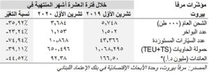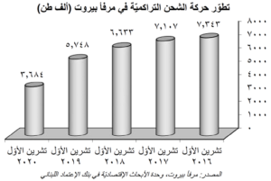 من جهة أخرى، تطوّر حجم الشحن عبر مرفأ بيروت الى حوالي ٤١٧ ألف طن خلال شهر تشرين الأول/أكتوبر ۲۰۲۰، مقابل ۳۷۲ ألف طن في الشهر الذي سبقه. أمّا على صعيد تراكميّ، فقد تراجع حجم الشحن العام بنسبة ٣٥،٩٢٪ على صعيد سنوي الى ٣،٦٨٤ ألف طن خلال الاشهر العشرة الأولى من العام ۲۰۲۰، من ٥،٧٤٨ ألف طن في الفترة نفسها من العام المنصرم. اضافة الى ذلك، انكمش عدد البواخر بنسبة ٢٣،٢٤٪ سنويًا الى ١،١٥٣، كما انخفض عدد السيّارات المستوردة بـ٧٤،٩٤٪ (٣٢،٤٩٨ سيّارة) الى ١٠،٨٦٨ في ظلّ الشحّ في السيولة بالدولار وهو ما يخنق عمليّة الاستيراد. من جهة أخرى، استقبل مرفأ بيروت حاويات ذات قدرة استيعاب بلغت حوالي ٦٥٠،٤٩٦ ألف وحدة مكافئة لعشرين قدم (TEU) خلال الاشهر العشرة الأولى من العام ۲۰۲۰ مقارنة مع ١،٠٦٨،٢٩٥ الف وحدة مكافئة لعشرين قدم (TEU) خلال الفترة نفسها من العام ۲۰۱۹. أخيرًا، انخفضت عائدات مرفأ بيروت بنسبة ٤٤،٥٢٪ على صعيد سنوي إلى ٩٢،٣٨ مليون د.أ. لغاية شهر تشرين الأول/أكتوبر ٢٠٢٠.