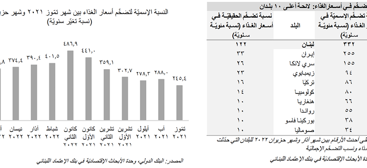 أصدر البنك الدولي بتاريخ ٢٩ تموز/يوليو ٢٠٢٢ الأرقام المحدّثة للأمن الغذائي والتي تعطي لمحة عن نسب التغيّر السنويّة لمؤشّر الغذاء في مؤشّر تضخّم الأسعار في عدد من البلدان حول العالم. بالتفاصيل، فقد كشف التقرير أنّ نسبة تضخّم أسعار الغذاء لا تزال مرتفعة حول العالم وفي كلّ فئات الدخل، حيث أنّ ٩٣،٨٪ من البلاد ذات الدخل منخفض و٨٩،١٪ من البلاد ذات الدخل المتوسّط الأدنى و٨٩،٠٪ من البلاد ذات الدخل المتوسّط المرتفع قد شهدت نسب تضخّم إجماليّة تخطّت عتبة الـ٥٪، كما وأنّ لدى بعضها نسب تضخّم فاقت نسبة الـ١٠٪. وقد أضاف التقرير أنّ ٧٨،٦٪ من البلدان ذات الدخل المرتفع تعاني من نسب تضخّم عالية ونسب تضخّم مرتفعة في مؤشّر أسعار الغذاء. كما وأضاف التقرير أنّ البلدان التي عانت من أعلى نسب تضخّم في أسعار الغذاء هي تقع في القارّة الأفريقيةّ وشمال أميركا وأميركا اللاتينيّة وجنوب آسيا وأوروبّا وآسيا الوسطى. وقد أشار التقرير أنّ نسبة التضخّم الحقيقيّة في أسعار الغذاء قد تخطّى نسبة التضخّم الحقيقيّة الإجماليّة في ٧٨،٧٪ من البلاد الـ١٦٠ المشمولة في التقرير. يتبيّن خلال الأرقام أنّ لبنان قد سجّل أعلى نسبة تضخّم إسميّة في أسعار الغذاء حول العالم خلال الفصل الثاني من العام ٢٠٢٢ (٣٣٢ نسبة تغيّر سنويّة في مؤشّر تضخّم أسعار الغذاء)، تبعته زيمبابوي (٢٥٥٪) وفينزويلا (١٥٥٪) وتركيّا (٩٤٪). أمّا في ما خصّ نسبة التضخّم الحقيقيّة في أسعار الغذاء في لبنان، فقد بلغت نسبة التغيّر السنويّة لأسعار الغذاء ١٢٢٪ في الفصل الثاني من العام ٢٠٢٢، تبعه إيران (٣٣٪)، وسري لانكا (٢٦٪) وزيمبابوي (٢٣٪)، للذكر لا للحصر. وقد أشار التقرير في هذا الإطار أنّ الإرتفاع التاريخي في أسعار الغذاء في لبنان قد تسبّبت بنقص في الغذاء لدى حوالي ١٩٪ من السكّان.
