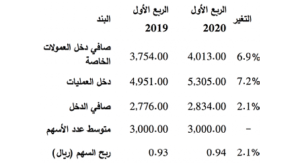 ارتفعت أرباح البنك الأهلي التجاري، والذي يعتبر أكبر بنك سعودي من حيث الموجودات، إلى ٢٨٣٤ مليون ريال في نهاية الربع الأول من عام ٢٠٢٠، بنسبة قدرها ٢٪، مقارنة بأرباح ٢٧٧٦ مليون ريال تم تحقيقها خلال الفترة نفسها من عام ٢٠١٩.